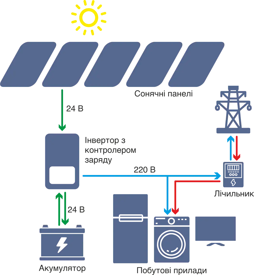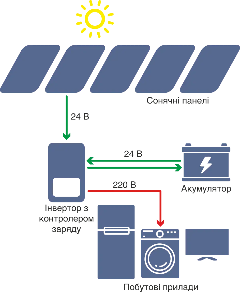 | Сонячний день, АКБ не повна | Сонячні панелі | Заряджаються акумулятори |